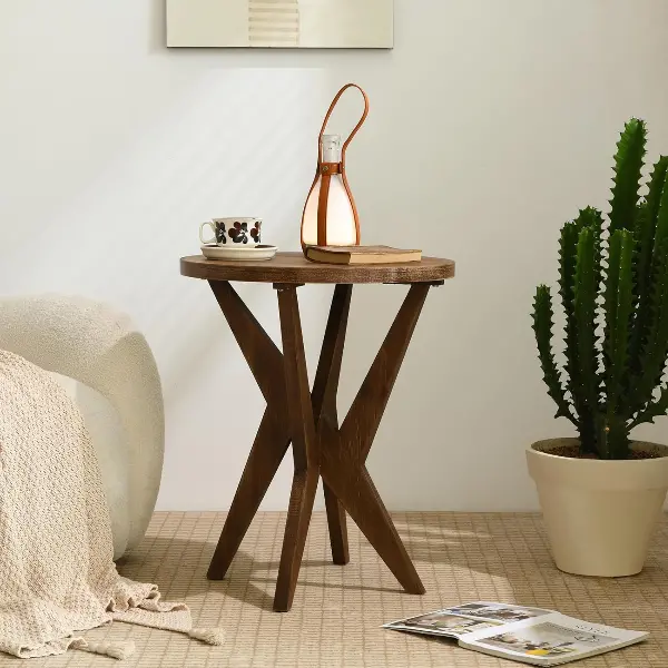 Farmhouse Round End Table with MDF Top and Crossed Legs, Boho Side Table Mid Century Modern Small Accent Table for Small Space Stable Nightstand for Living Room, Natural Wood Brown 1-Pack