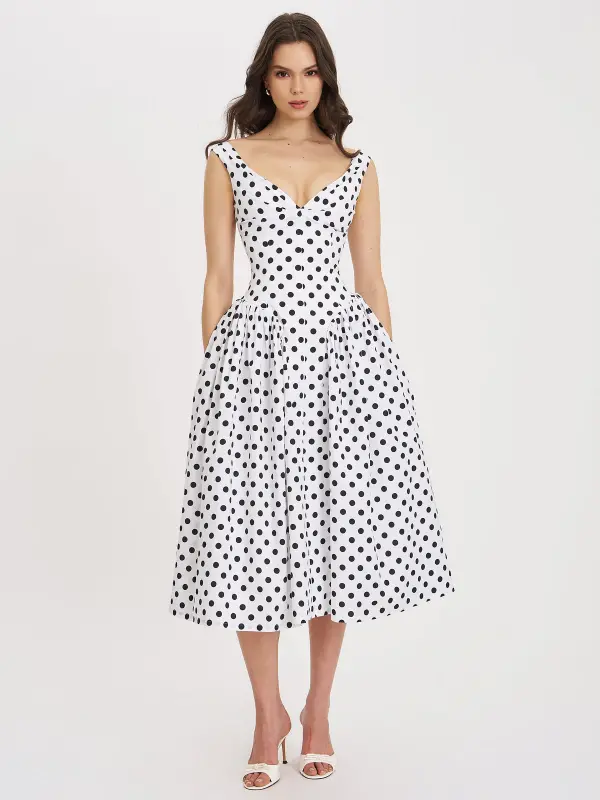 polka dot drop waist midi cotton poplin dress 🤍