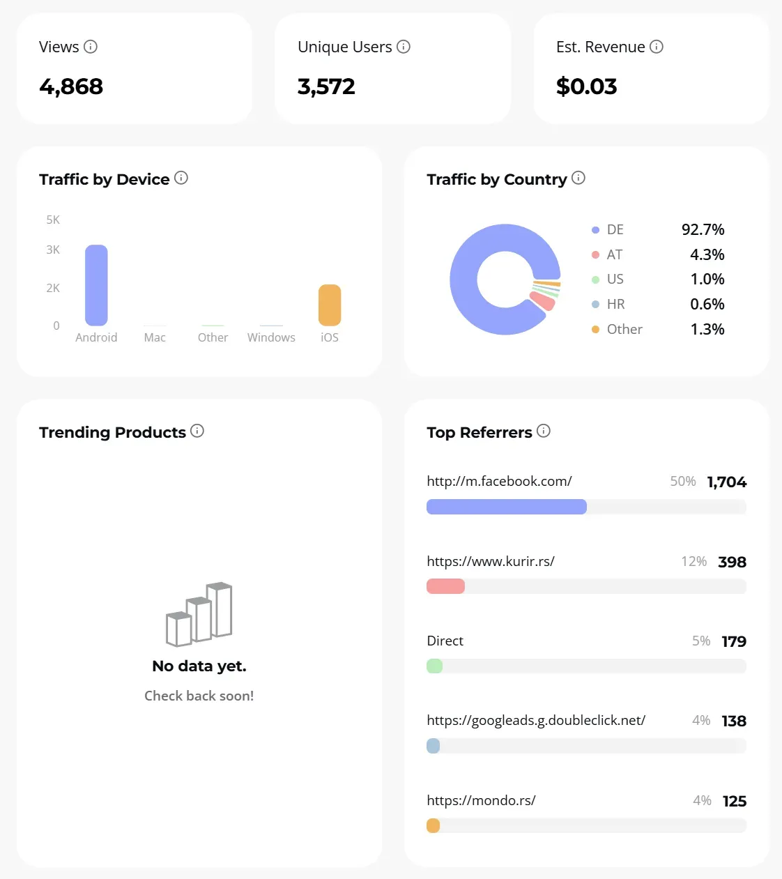 - Top referrers / sources: See where your visitors are coming from—Instagram/TikTok bios, direct URLs, portals, blogs, or other websites.