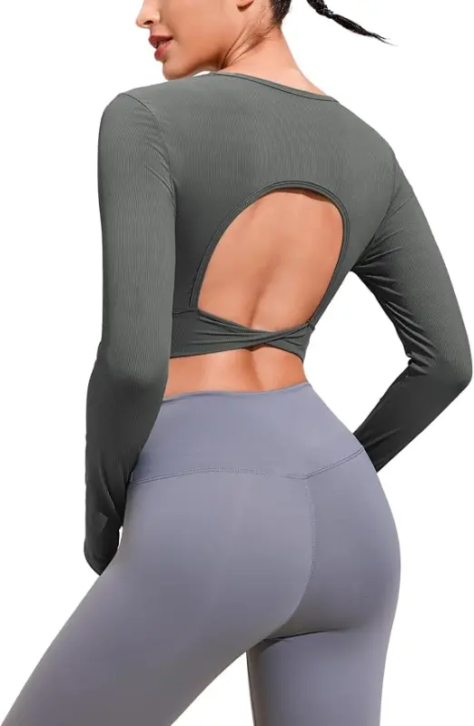 PINSPARK Long Sleeve Crop Top Ribbed Workout Tops Open Back Yoga Shirts Twist Knot Cropped T-Shirt with Thumb Hole XS-XL Small Grey